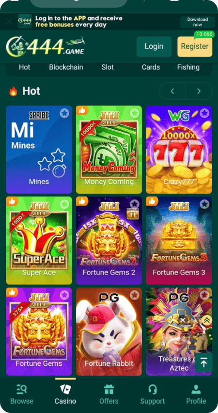 C444 Game is a casino-style gaming application for Android that acts as a combined platform for games of different genres. Instead of juggling various apps, gamers here can enjoy slot machines, card games, table games, and instant games all on one single easy-to-use platform.